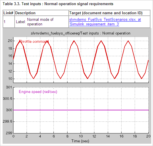 Список требований, связанных с каждой группой сигналов в любом блоке Signal Builder, и графика этой группы сигналов. В этом примере блок Test Inputs Signal Builder в модели верхнего уровня имеет одну группу сигналов, имеющую связь требований. Щелкните по ссылке в разделе Target (Target) (имя документа и идентификатор местоположения), чтобы открыть документ требований, связанный с этой группой сигналов, в блоке Test inputs.