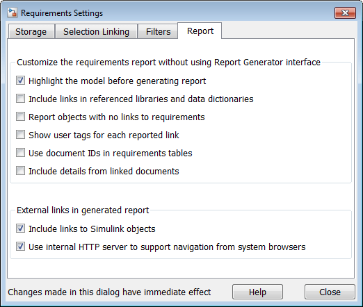 Использование внутреннего HTTP-сервера для поддержки навигации из системных браузеров | Определяет использование внутреннего HTTP-сервера MATLAB для навигации из сгенерированного отчета в документы и объекты модели. При выборе этого параметра эта навигация доступна из системных браузеров, если внутренний HTTP-сервер MATLAB активен на локальном хосте. Для запуска внутреннего HTTP-сервера в командной строке MATLAB введите |