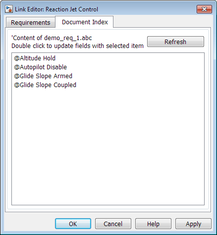 Для demo_req_1.abc в диалоговом окне «Исходящие связи: управление реактивной струей» перейдите на вкладку «Индекс документа». ContentsFcn функция автоматически генерирует индекс документа.