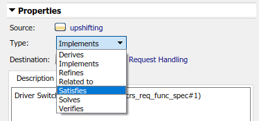 Можно выбрать пользовательское требование или тип связи в редакторе требований. Чтобы выбрать тип настраиваемого требования, щелкните Показать требования (Show Requirements) и выберите требование. На панели Подробно (Details) в разделе Свойства (Properties) выберите тип настраиваемого требования в выпадающем списке Тип (Type).