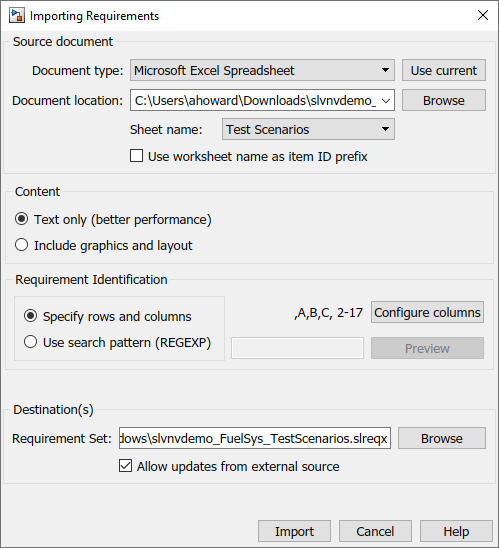 Чтобы определить требования путем указания строк и столбцов, в диалоговом окне «Импорт требований» в разделе «Идентификация требований» выберите «Указать строки и столбцы».