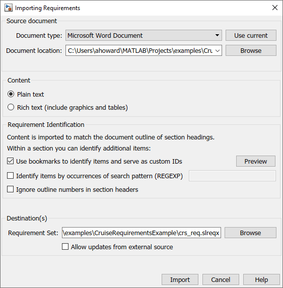 При импорте требований из документов Microsoft Word заголовки и номера разделов заполняют поля ID и Summary, а тело раздела заполняет поле Description. Чтобы игнорировать номера сечений в импортированных требованиях, выберите Игнорировать номера сечений в заголовках сечений. Если выбран параметр Разрешить обновления из внешнего источника, рекомендуется игнорировать номера структуры, чтобы предотвратить непредвиденное поведение, которое может произойти при изменении номеров разделов при внесении изменений в документ Microsoft Word, а затем обновить импортированные требования. Например, при вставке нового раздела в середине документа некоторые номера структуры в заголовках разделов изменяются в соответствии с новой нумерацией разделов. При обновлении набора требований Simulink Requirements удаляет ссылочные требования, соответствующие разделам, номера структуры которых были изменены, и повторно вставляет их с обновленной нумерацией. Это может привести к непредвиденным и ненужным изменениям.