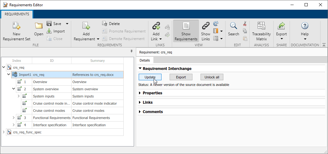 () в редакторе требований. Разблокируйте все требования, на которые имеются ссылки, перейдя в верхний узел Импорт, и на панели Подробно в разделе Обмен требованиями щелкните Разблокировать все. Невозможно удалить ссылочные требования или изменить их иерархию в рамках Simulink Requirements даже после их разблокировки. Вы не можете повторно заблокировать требования после их разблокировки, за исключением обновления всего набора требований, на который имеются ссылки. Обновление указанных требований перезаписывает изменения, внесенные после разблокирования указанных требований.