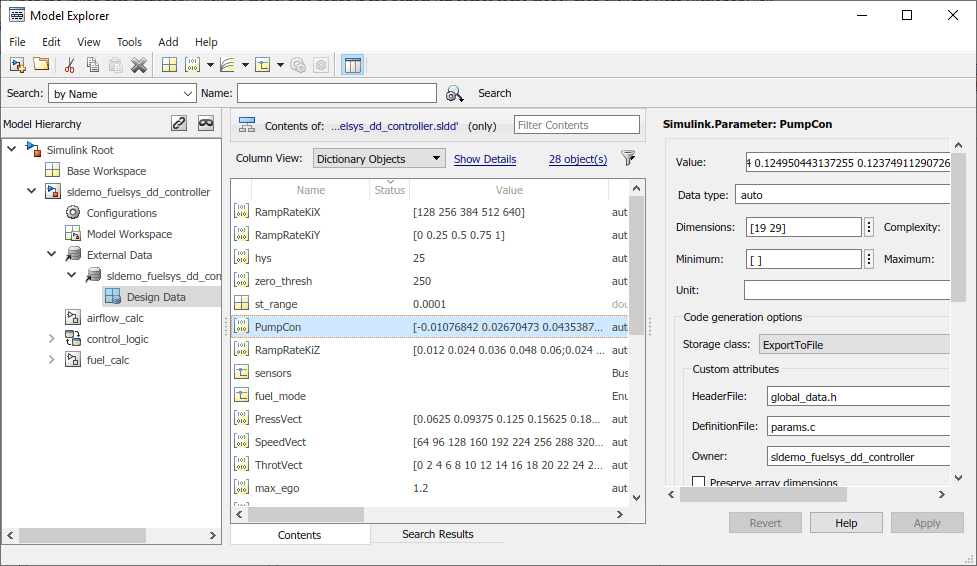 На панели Иерархия модели (Model Hierarchy) Обозревателя моделей (Model Explorer) в узле Внешние данные (External Data) разверните узел sldemo_fuelsys_dd_controller узел словаря данных.
