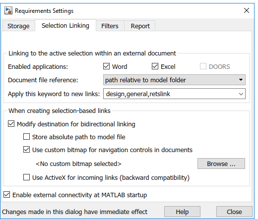 В диалоговом окне «Параметры требований» на вкладке «Связь с выделением» используйте следующие параметры для связывания с активным выделением в поддерживаемом документе.