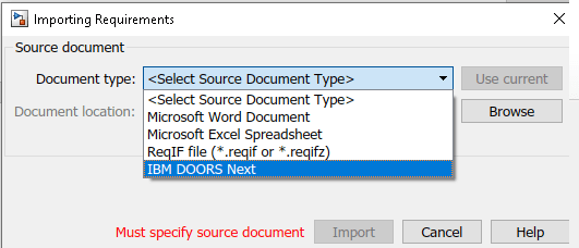 В диалоговом окне «Импорт требований» задайте для параметра «Тип документа» значение IBM DOORS Next.