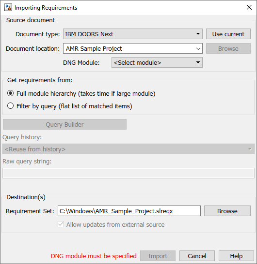 При импорте из проекта DOORS Next с включенным управлением конфигурацией перед импортом необходимо задать требуемый контекст конфигурации для сеанса MATLAB. Дополнительные сведения о настройке сеанса MATLAB см. в разделе slreq.dngConfigure. Импортированный набор требований будет связан с этой конфигурацией для навигации с помощью команды Показать в обновлении документа с помощью действия Обновить с сервера. Дополнительные сведения см. в разделе Связывание и обновление импортированных элементов DOORS в требованиях Simulink.