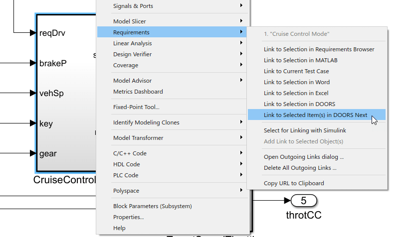 Щелкните правой кнопкой мыши элемент модели Simulink, который требуется связать с требованиями IBM DOORS Next.