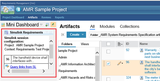 Установите графический элемент Simulink Requirements в IBM DOORS Next. Дополнительные сведения см. в разделе Установка виджета требований Simulink в IBM DOORS Next. Чтобы подтвердить, что виджет работает так, как ожидалось, в проекте DOORS Next на вкладке «Артефакты» выберите элемент и убедитесь в том, что содержимое виджета обновляется соответствующим образом.