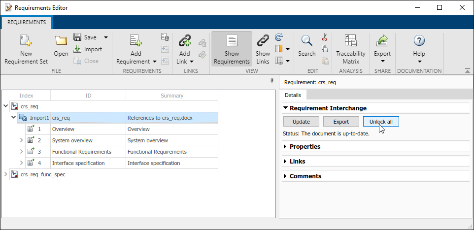 Перед редактированием импортированного требования ссылки его необходимо разблокировать. Чтобы разблокировать все требования в наборе требований, выберите узел верхнего уровня Импорт набора требований и на панели Подробно в разделе Обмен требованиями щелкните Разблокировать все.