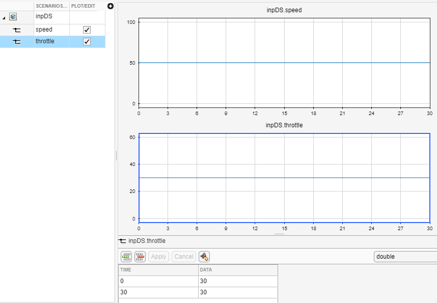Выберите дроссельный сигнал и введите 30 для времени 0 и 30. Нажмите кнопку Применить (Apply), чтобы обновить график.