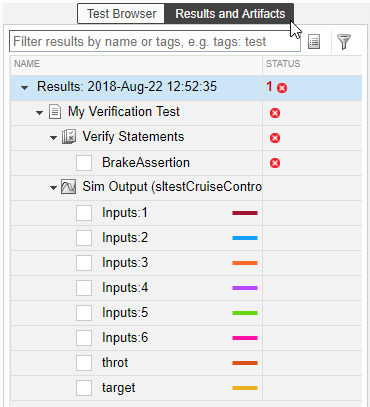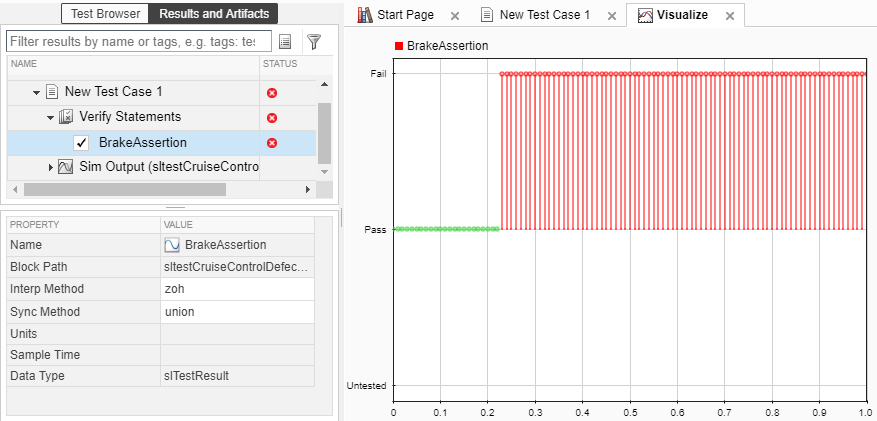 Этот тестовый случай можно выполнить без указания других оценок, поскольку модель содержит блок утверждения. Использование Диспетчера тестов (Test Manager) в отличие от моделирования самой модели позволяет просматривать, управлять и экспортировать результаты. Кроме того, она настраивает тестовую инфраструктуру для добавления дополнительных тестов, сбора базовых данных и повторного использования тестов для других действий по проверке, таких как проверка генерации кода.