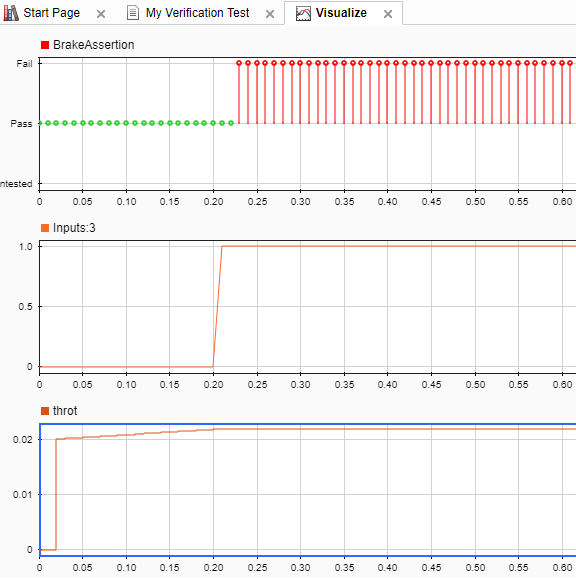 Базовые тесты сравнивают результаты моделирования с ожидаемыми результатами. В исправленной версии модели дроссель переходит в 0, если тормоз применяется в течение трех временных шагов. Поскольку модель верна, необходимо зафиксировать правильные результаты в тестовом примере для проверки в будущем.