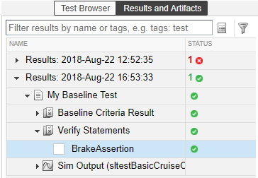 Изучите результаты. Тест не прошел. Щелкните правой кнопкой мыши самый новый результат и выберите Развернуть все под (Expand All Under), чтобы просмотреть все результаты. Не удалось выполнить тест, так как BrakeAssertion не удалось.