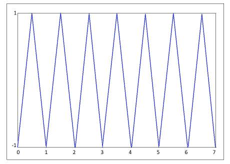 triangle( создает треугольную волну с периодом 1 и диапазоном от -1 до 1. В интервале 0 < = x < 0,5 ,x)triangle(x) увеличивается. Разница между треугольными волнами и пилообразными волнами заключается в том, что треугольная волна имеет равные времена подъема и падения.