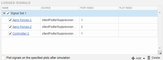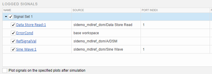 Сигналы появляются в таблице Logged Signals в тестовом примере.