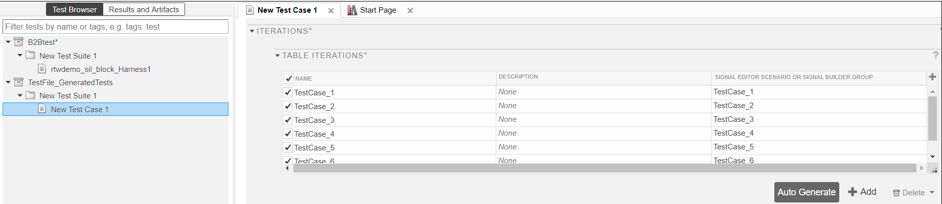 В диспетчере тестов новый тестовый пример отображает тестируемую систему и тестовый жгут, содержащий сгенерированные входные данные в источнике редактора сигналов. Разверните раздел Итерации (Iterations), чтобы увидеть итерации, соответствующие сценариям сигнала.
