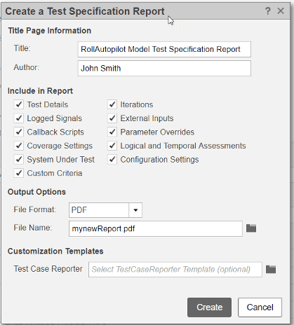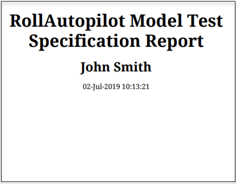 В диалоговом окне Create a Test Specification Report укажите название как RollAutopilot Model Test Specification Report и Автора как John Smith.