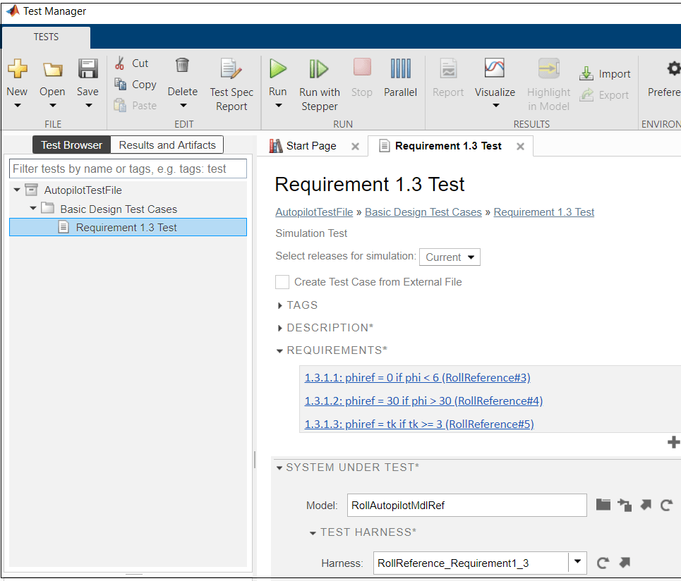 В этом примере используется существующий тестовый файл (AutopilotTestFile.mldatx), который был создан для RollAutopilotMdlRef.slx модель и ее RollReference_Requirement1_3 испытательный жгут.