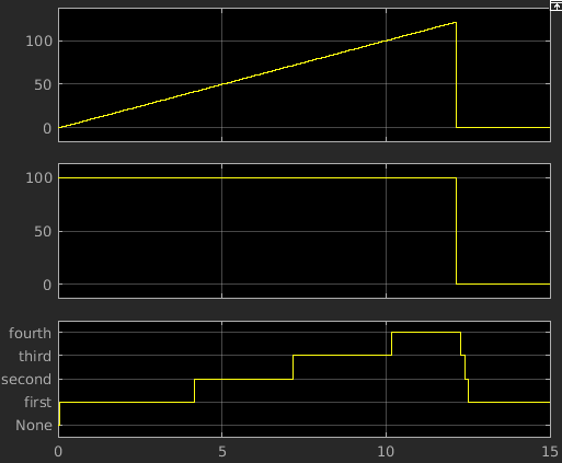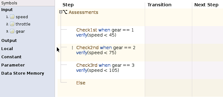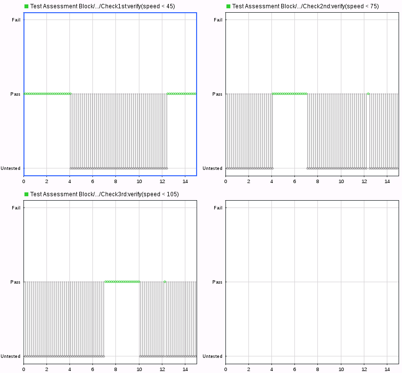 Это, когда декомпозиция содержит три verify заявления. Каждый verify оператор активен, когда сигнал gear равно другому значению. Дополнительные сведения см. в разделе Оценка модели с помощью метода декомпозиции.