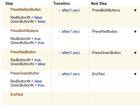 Эта тестовая последовательность устанавливает значение логических выходов RedButtonIn и GreenButtonInс переходами, происходящими после того, как каждый шаг был активен в течение 1 секунды.