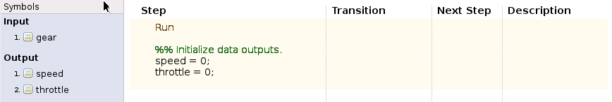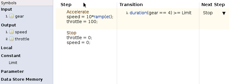 Введите условие перехода для Accelerate шаг. В этом примере: Accelerate переходы в Stop когда система находится на четвертой передаче в течение 2 секунд. В столбце «Переход» введите: