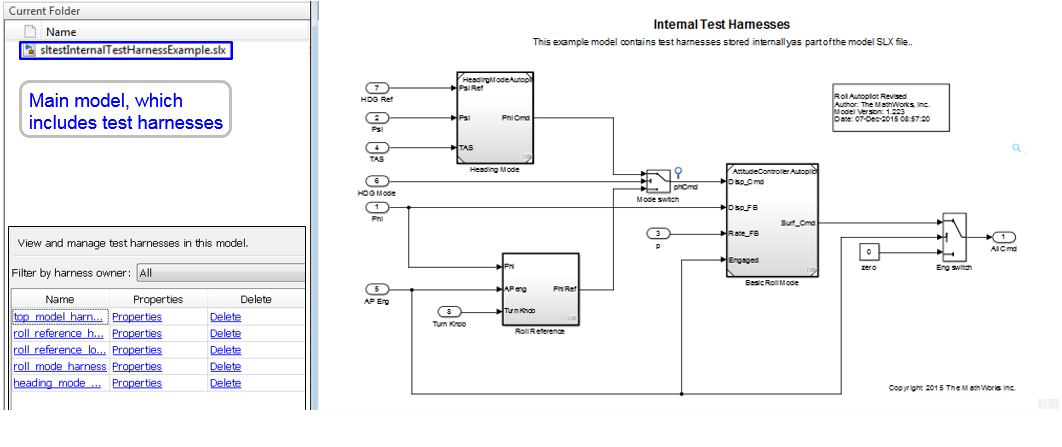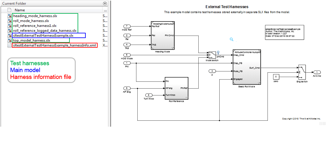 Жгуты, хранящиеся снаружи, используют отдельный SLX-файл для каждого жгута и <modelName>_harnessInfo.xml файл, содержащий метаданные, связывающие модель и жгуты. Изменение тестовых жгутов может изменить harnessInfo.xml файл. Метаданные и модель связаны с использованием уникального идентификатора модели. XML-файл метаданных тестовых кабелей создается и сохраняется по умолчанию в той же папке, что и модель. При необходимости можно переместить XML-файл метаданных в другую папку по пути MATLAB. Связь между моделью и ее жгутами сохраняется до тех пор, пока файл метаданных кабельных трасс, модель и жгуты находятся на пути MATLAB.