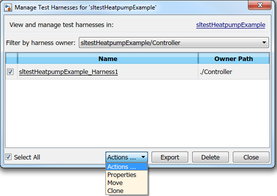 Чтобы переместить или клонировать жгуты, щелкните правой кнопкой мыши холст Simulink и выберите «Тестовый жгут» > «Управление тестовыми жгутами». Откроется диалоговое окно Управление тестовым жгутом (Manage Test Harness), в котором перечислены тестовые жгуты, связанные с подсистемой или блоком, указанным в разделе Фильтр по владельцу жгута (Filter by harness owner). Щелкните Действия (Actions), чтобы открыть опции Переместить (Move) и Клонировать (Clone).