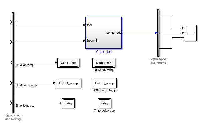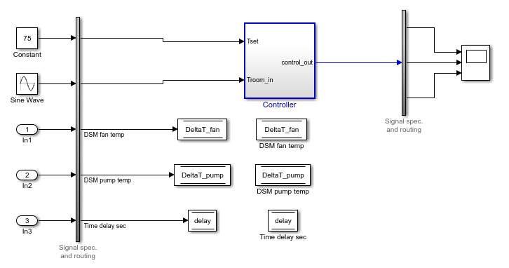 Установка принимает шину управления. Тепловой насос и сигналы вентилятора являются булевыми, а направление теплового насоса определяется +1 для охлаждения и -1 для обогрева.