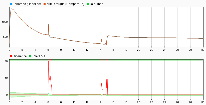 В области результатов «Критерии опорной структуры» выберите output torque под Passing для просмотра результатов сравнения. Passing результат не получается из-за переходных сигналов, которые выходят за пределы относительного допуска.