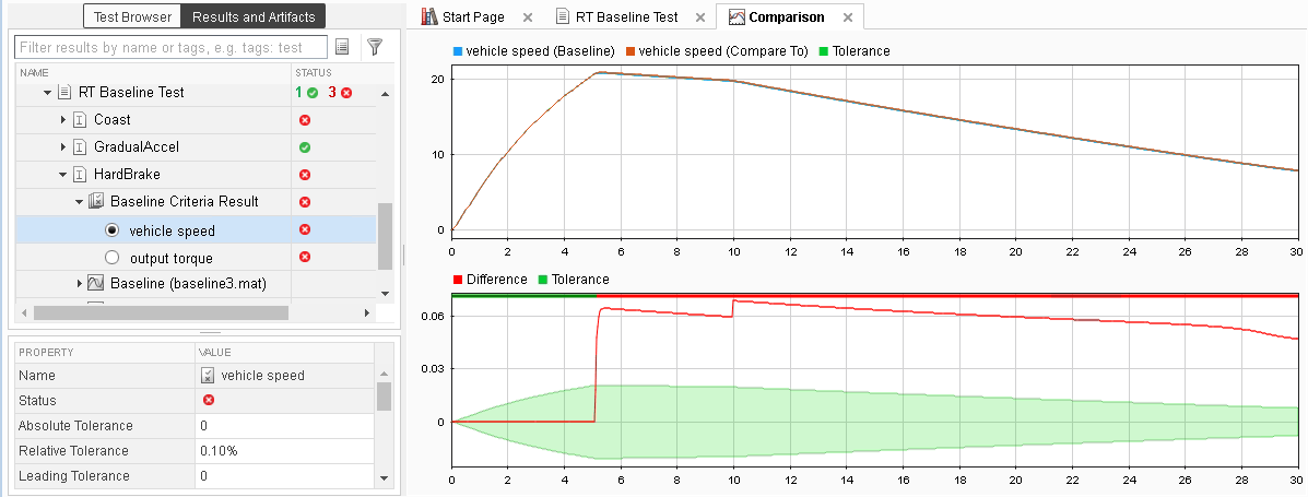 В этом примере несколько сценариев не выполняются из-за влияния синхронизации на вывод данных. Например, в HardBrake итерация, vehicle speed после применения тормоза выходной сигнал выходит за пределы относительного допуска. Чтобы устранить эту ошибку, можно: