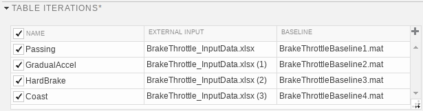 Назначьте имя итерации и выберите элементы для итерации. Например, этот тестовый случай имеет четыре итерации. Каждая итерация использует различную комбинацию внешних входных и базовых данных.