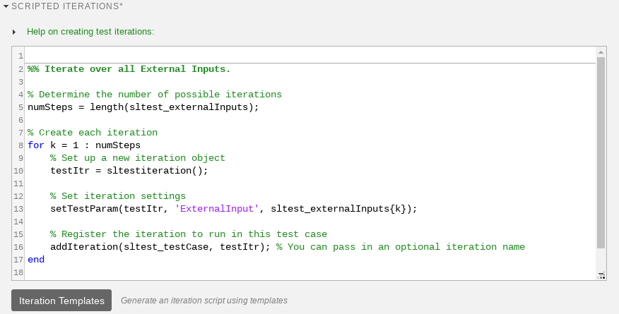 %% Iterate Over All Signal Editor Scenarios % Determine the number of possible iterations numSteps = length(sltest_signalEditorScenarios); % Create each iteration for k = 1 : numSteps % Set up a new iteration object testItr = sltestiteration; % Set iteration settings setTestParam(testItr,'SignalEditorScenario',... sltest_signalEditorScenarios{k}); % Add the iteration to run in this test case % You can pass in an optional iteration name addIteration(sltest_testCase,testItr); end % Reset the path rmpath(fullfile(matlabroot,'examples,... 'simulink_automotive','main'));