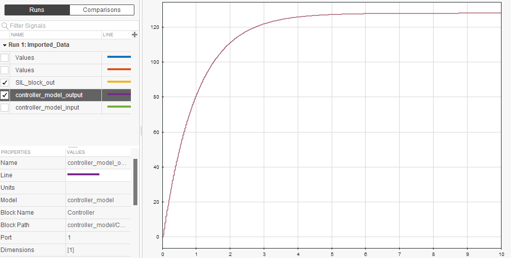 Выберите SIL_block_out и controller_model_out сигналы на панели Runs окна инспектора данных.