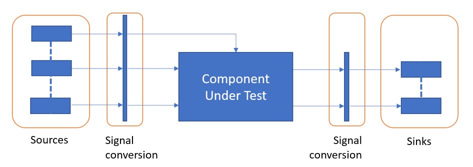 Тестовый электрический жгут состоит из одного или нескольких исходных блоков, управляющих тестируемым компонентом, который управляет одним или несколькими блоками-приемниками. При построении тестового жгута конфигурируются атрибуты сигнала, вызовы функций, хранилища данных и семантика выполнения. По возможности тестовый жгут соответствует атрибутам сигнала на интерфейсе источников, приемников и компонентов. Дополнительные сведения о выборе источников и поглотителей см. в разделе Источники и поглотители.