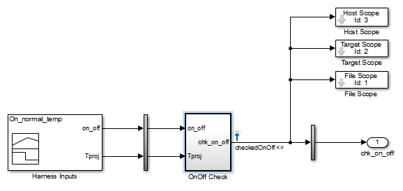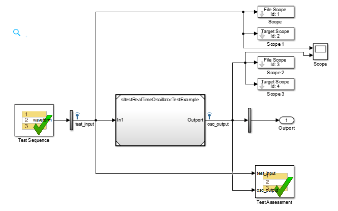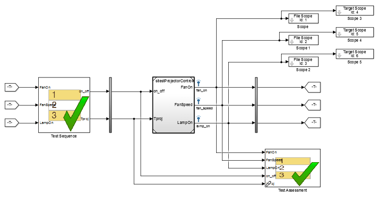 Создание тестовых жгутов для тестирования в реальном времени или повторное использование тестовых жгутов моделирования модели. В блоках тестовой последовательности или тестовой оценки, verify операторы оценивают выполнение в реальном времени. В тестовых жгутах используйте целевые области и области хоста для отображения сигналов во время выполнения.