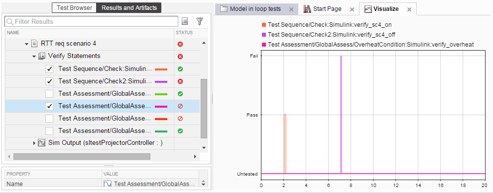verify ЗаявленияВ дополнение к сравнениям сигналов базовой линии и эквивалентности можно оценить выполнение теста в реальном времени с помощью verify заявления. A verify оператор оценивает логическое выражение и возвращает результаты в диспетчер тестов. Использовать verify внутри блока тестовой последовательности или тестовой оценки или, если у вас есть лицензия Stateflow ®, в диаграмме Stateflow. См. раздел Оценка моделирования модели с использованием операторов проверки.