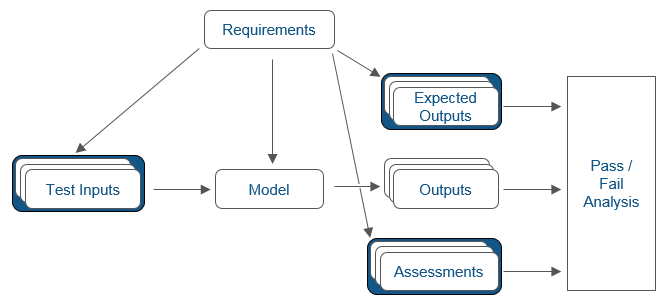Поскольку требования определяют поведение в ответ на определенные условия, можно разработать входные данные тестирования, ожидаемые результаты и оценки из требований модели.