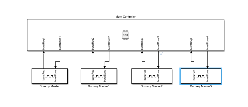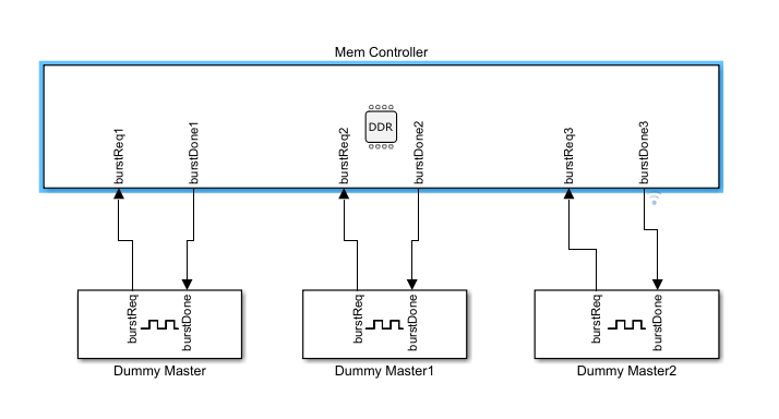 Рассмотрим модель с тремя ведущими (представленными блоками генератора трафика памяти), подключенную к блоку контроллера памяти.