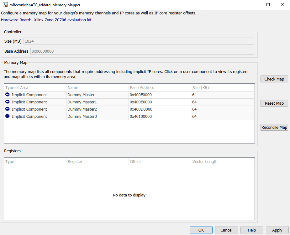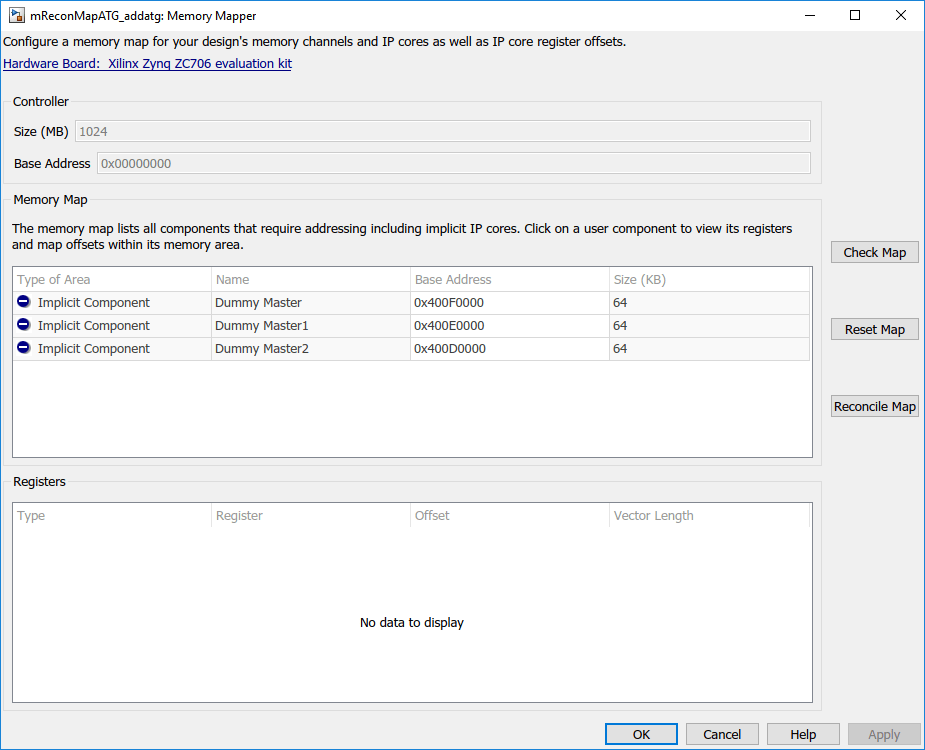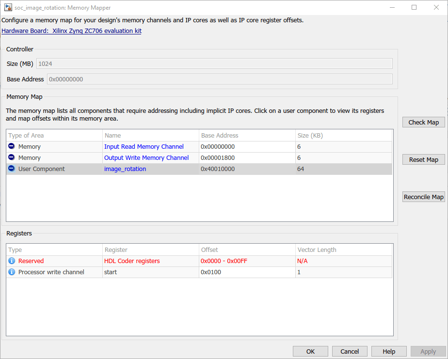 Reconcile Map - Согласование карты памяти с существующей модельюСогласовать карту памяти с существующей моделью. После добавления или удаления канала или регистра, отображенного на память, нажмите эту кнопку для синхронизации между моделью и картой памяти. Чтобы убедиться, что согласованная карта памяти действительна, щелкните Проверить карту после согласования.