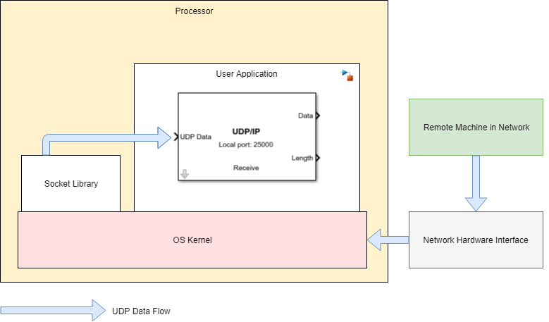 Блок чтения UDP получает пакеты UDP (протокол пользовательских дейтаграмм) от удаленного хоста на целевом приложении. Удаленный хост - это компьютер или оборудование, с которого требуется получать пакеты UDP. Блок считывает пакеты UDP из буфера сокетов UDP и возвращает пакеты UDP в виде одномерного массива.