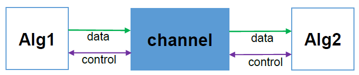 В физическом мире алгоритмы могут находиться на двух отдельных устройствах, и передача данных не происходит мгновенно. Кроме того, алгоритмы могут работать с различной скоростью и поэтому требуют буферизации и управляющей логики для квитирования. Например, простое рукопожатие, такое как «данные действительны» от производителя данных и «готовы принять данные» от потребителя, служит логикой управления.