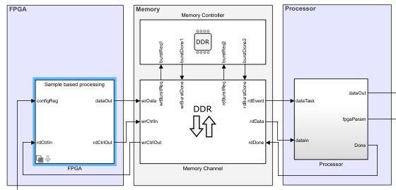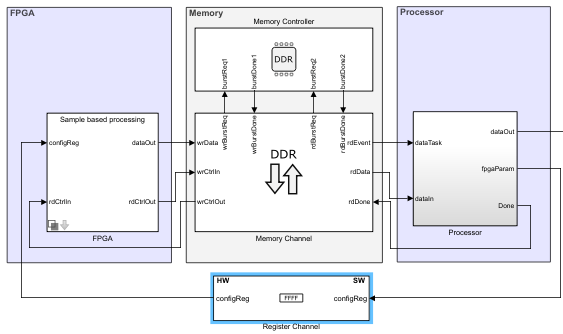 Канал памяти моделирует передачу данных от FPGA к процессору с использованием совместно используемой внешней памяти. Канал регистра моделирует управление логикой FPGA от процессора. Можно настроить логику FPGA и считывать состояние логики FPGA с процессора. В следующих разделах показано, как создавать эти канальные соединения.