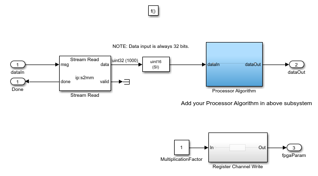 Процессорная система в этом приложении SoC считывает данные из внешней памяти после записи из FPGA в эту память. Поскольку записи FPGA и взаимодействие с внешней памятью асинхронны, процессор использует управляемую событиями задачу для чтения из памяти. Программное обеспечение также управляет регистром на FPGA, который определяет коэффициент умножения, используемый в алгоритме FPGA.