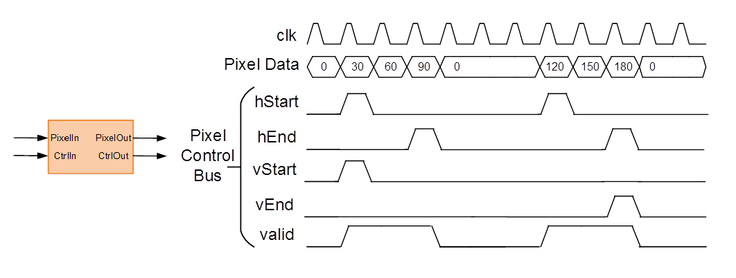 Сигнал пиксельных данных является первичным видеосигналом, который передается через интерфейс AXI4-Stream Video. Когда сигнал Pixel Data является действительным, утверждается действительный сигнал.