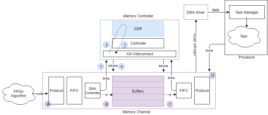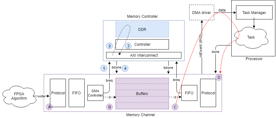 Путь передачи данных от алгоритма FPGA к процессору обслуживается через драйвер DMA и процессор задач и иллюстрируется на этом изображении.