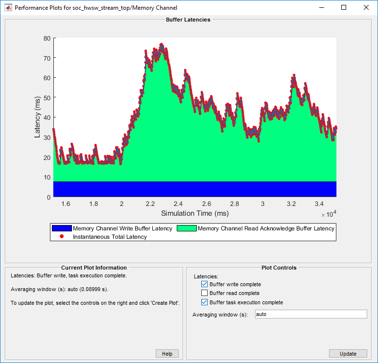 Информация о задержке канала памяти доступна после моделирования для каждого канала. После моделирования модели откройте блоковую маску канала памяти. На вкладке Производительность (Performance) щелкните Запуск графиков производительности (Launch performance plots). Это действие открывает новое окно с несколькими параметрами управления для отображения этих различных задержек: