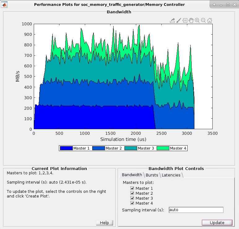 На вкладке Пропускная способность выберите основные параметры, для которых требуется построить график пропускной способности. Щелкните Создать график (Create Plot), чтобы увидеть полосу пропускания в мегабайтах в секунду для выбранных основных объектов в течение времени моделирования. На этом рисунке показана полоса пропускания для примера «Анализ полосы пропускания памяти с использованием генераторов трафика».