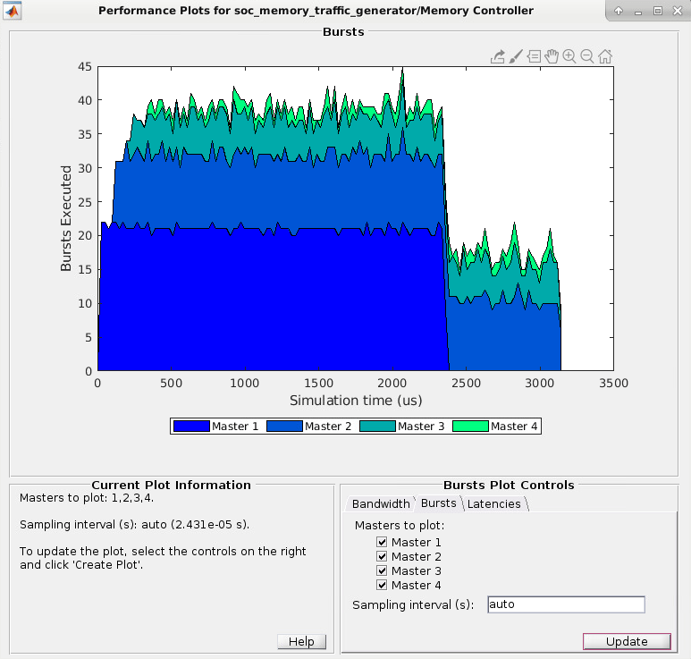SoC Blockset™ позволяет проводить постсимуляционный анализ диагностических данных памяти. Эти графики обеспечивают высокоуровневую диагностику производительности системы памяти модели. Эти графики являются расчетными измерениями на основе моделирования модели. Он учитывает тип данных, время выборки и тактовую частоту для расчета пропускной способности модели памяти и количество пакетов, выполняемых на порт памяти.