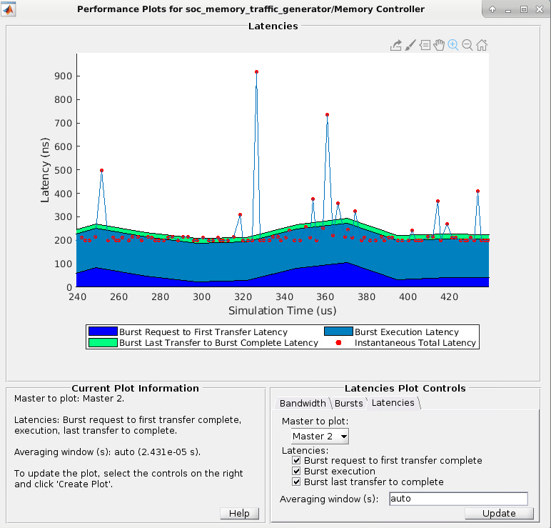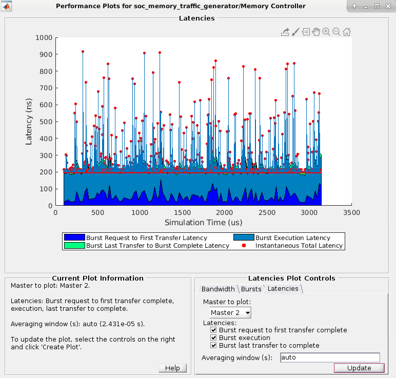 Информация о задержке контроллера памяти доступна после моделирования. После моделирования модели откройте маску блока контроллера памяти. На вкладке Производительность (Performance) щелкните Запуск графиков производительности (Launch performance plots). Это действие открывает новое окно с несколькими параметрами управления для отображения метрик производительности.